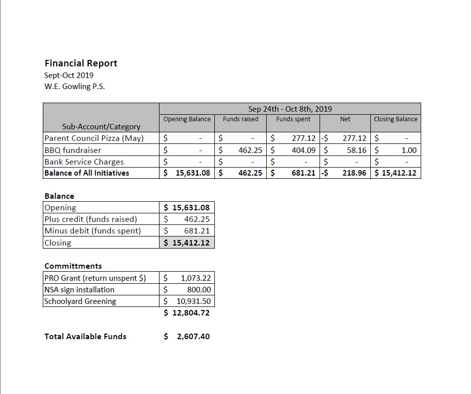 As part of our due diligence and transparency requirements, financial reports are prepared for each council meeting that detail the funds raised and spent for the period between meetings. Attached, please find the reports for the school years 2016-17 to 2019-20.